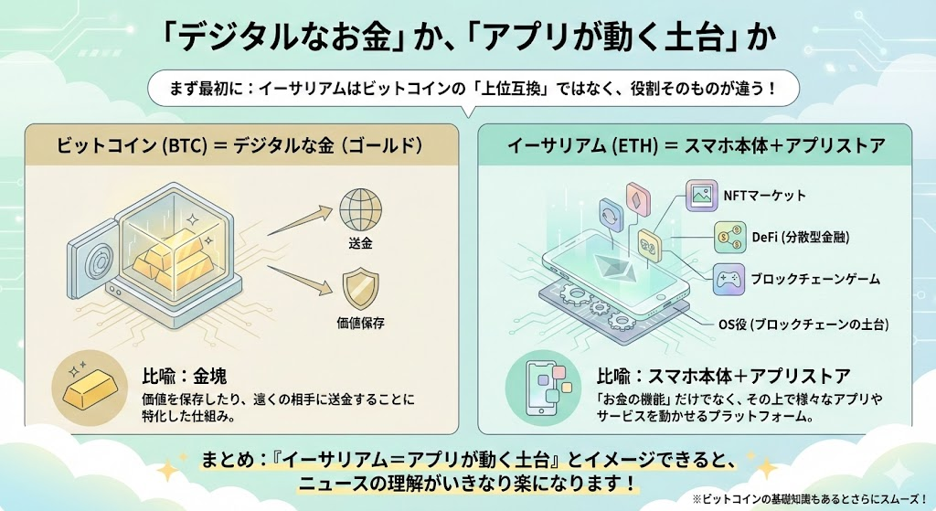 まず最初に押さえたいのは、イーサリアムはビットコインの「上位互換」ではなく、役割そのものが違うという点です。