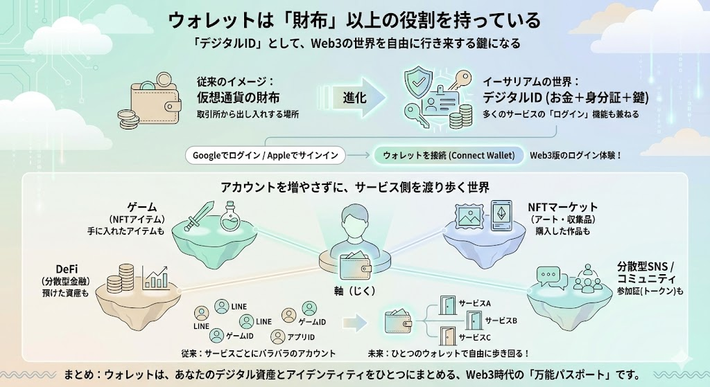 しかしイーサリアムの世界では、ウォレットは「お金+身分証+鍵」が合体したデジタルIDのような役割も持っています。
