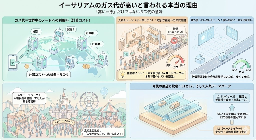 もちろん「高いままでOK」という話ではありません。イーサリアムは、安全性と分散性を重視したベースレイヤー(L1)はしっかり守りつつ、後で説明するL2(レイヤー2)という仕組みで速度と手数料を改善しようとしています。