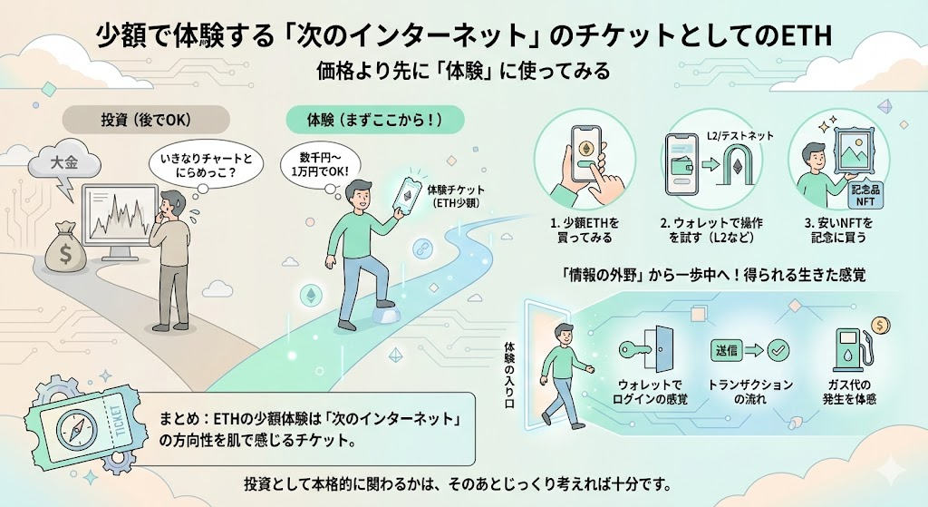イーサリアムを少額で体験することは、「次のインターネットがどんな方向に進んでいるか」を肌で感じるチケットだと考えてみてください。