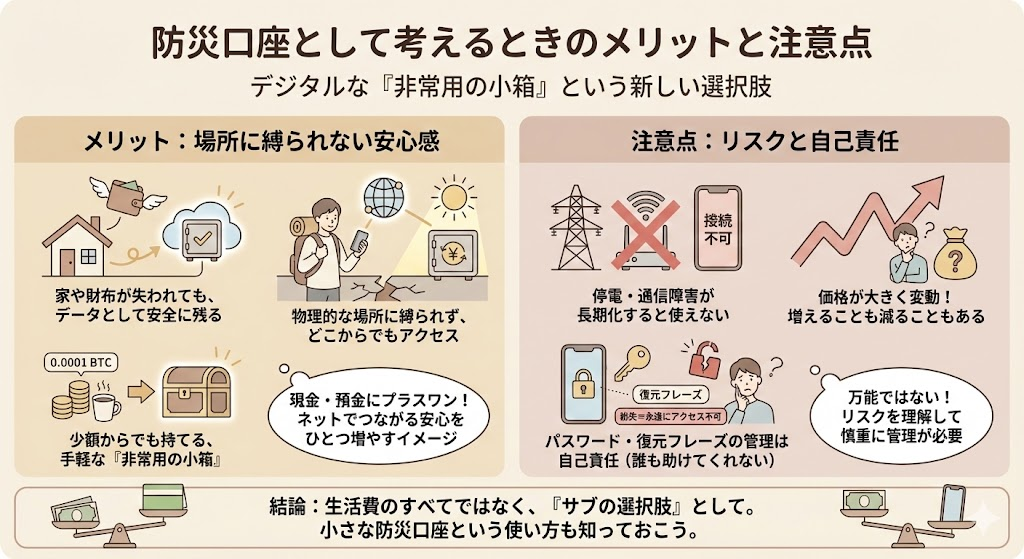 メリットは、家や財布が失われてもデータとして残ること、物理的な場所に縛られないこと、少額からでも持てることです。現金・預金・電子マネーに加えて、「ネットがつながれば取り出せる非常用の小箱を一つ増やす」というイメージで考えるとわかりやすいでしょう。