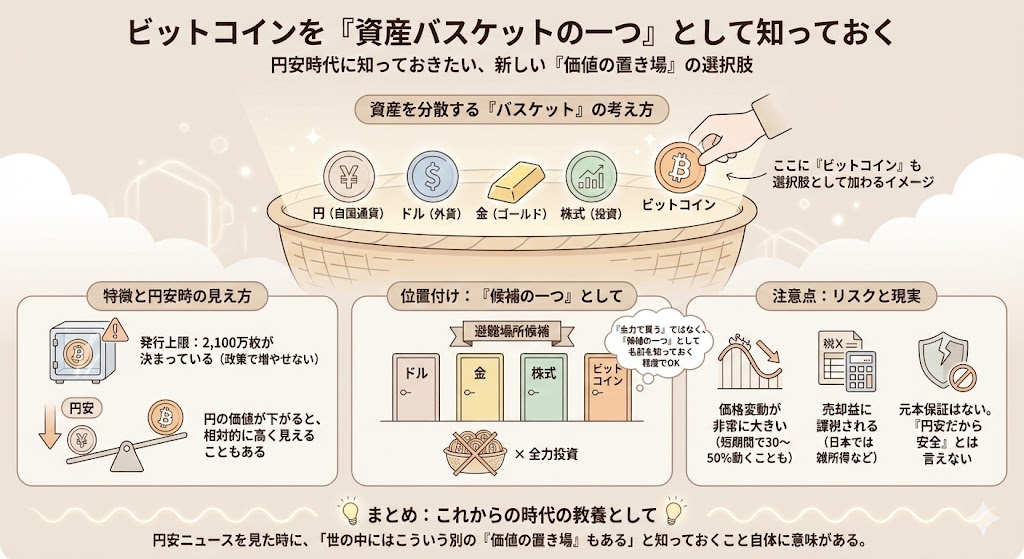 もちろん、ビットコイン自体の価格変動は非常に大きく、短期間で 30〜50%動くこともあります。日本では売却益に課税され、元本保証もありません。「円安が怖いからビットコインに逃げれば安全」とは全く言えません。ただ、「円安ニュースを見たときに、世の中にはこういう別の“価値の置き場”もある」と知っておくこと自体は、これからの時代の教養として意味があります。