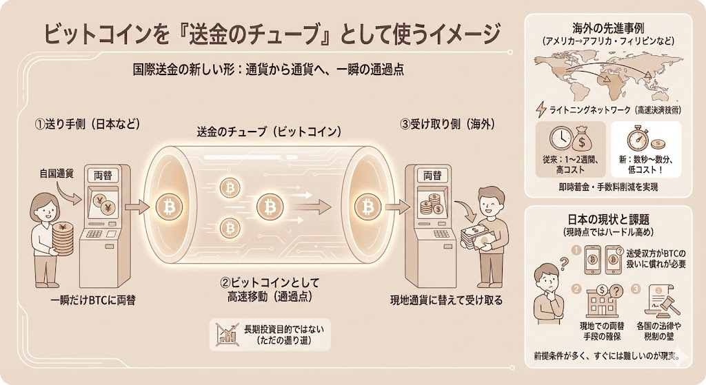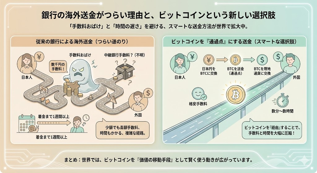 この「手数料おばけ」と「時間の遅さ」を避ける選択肢として、世界ではビットコインを“通過点”として使う海外送金が広がりつつあります。