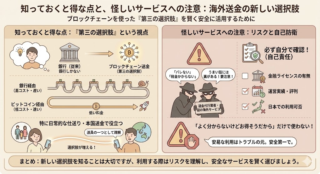 「海外送金=銀行しかない」という思い込みから一歩離れて、ブロックチェーンを使った“第三の選択肢”が世界にはあると知っておくこと自体は大きな意味があります。特に、仕送りや本国送金が日常的にある人にとって、ビットコインは「高コストな銀行送金を避けるための道具の一つ」として理解しておくと、選択肢が増えます。