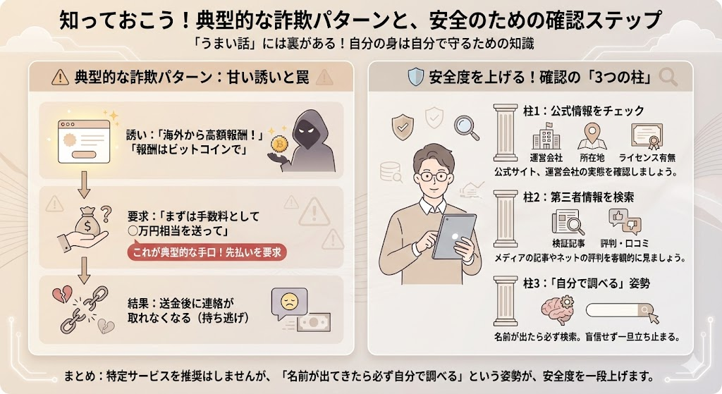 特に注意したいのが、「海外から高額報酬」「報酬はビットコイン」「まずは手数料として○万円相当を送って」といった誘いです。これは典型的な詐欺パターンで、お金を送った後に連絡が取れなくなるケースが多く報告されています。