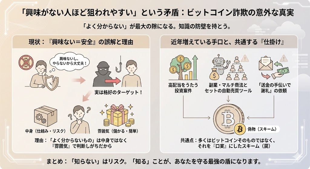 「ビットコインなんて興味ないし、やらないから大丈夫」と思っている人ほど、実は詐欺のターゲットになりやすい側面があります。理由はかんたんで、「よく分からないもの」を説明されたとき、人は中身ではなく「雰囲気」で判断してしまいがちだからです。