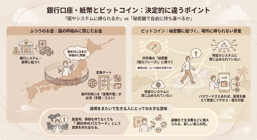 ビットコインの特徴は、所有権がウォレットの秘密鍵に紐づいていることです。極端な話、その秘密鍵(あるいは 12〜24 語の復元フレーズ)さえ覚えていれば、スマホや通帳を持たずに国外へ移動し、現地で新しいスマホにウォレットを復元して資産にアクセスする、ということが理屈としては可能です。