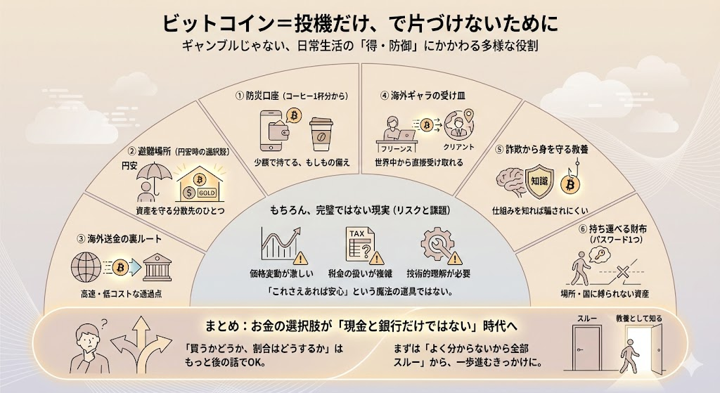 まずは、「ビットコインって、ギャンブルだけの話じゃないんだ」「日常生活の“得・防御”にもかすってくるんだな」とうっすらイメージできれば十分です。