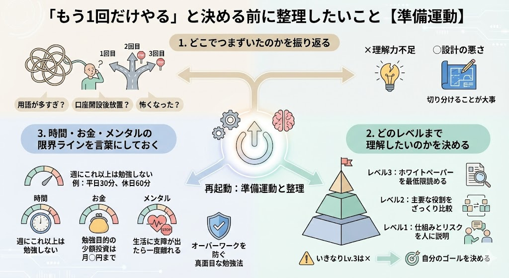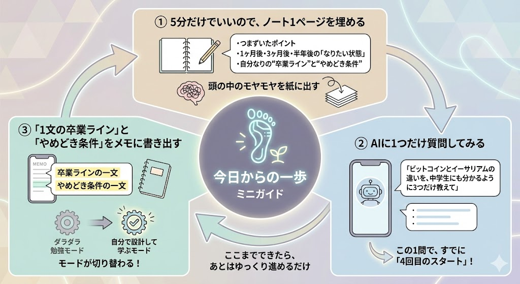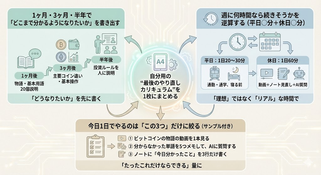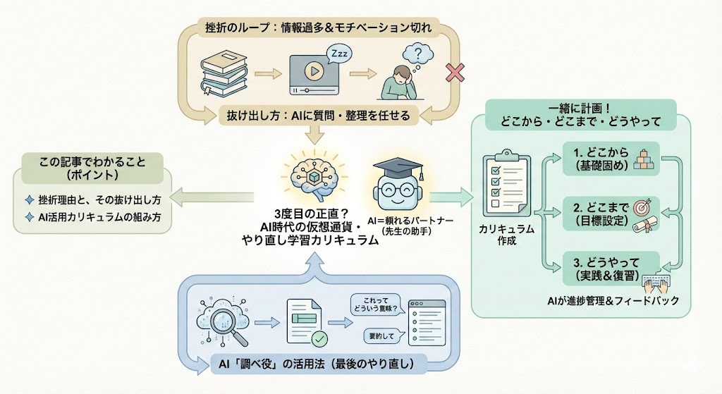 仮想通貨の本を買って、動画も見て、それでも気づいたら勉強が止まっている。そんな「3回目の挫折」にいる人に向けて、AI時代のやり直し方を、先生がカリキュラムを組むように整理してみます。テスト勉強の計画を立て直すように、「どこから・どこまで・どうやって」を一緒に決めていきましょう。