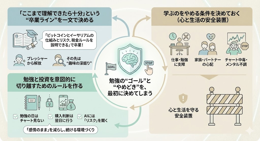 「ビットコインとイーサリアムの仕組みとリスク、そして日本での税金のざっくりしたルールを、自分の言葉で説明できるようになったら、一度“仮想通貨の勉強は卒業”とする。」