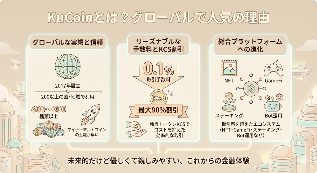 KuCoin(クーコイン)は、数多くのアルトコインを扱うことで知られるグローバル取引所です。しかし、その真価は「取引所」という枠を超えた、エコシステム全体の設計にあります。本記事では、初心者にもわかりやすく、投資家にとっても学びになる形で、その魅力を深掘りします。