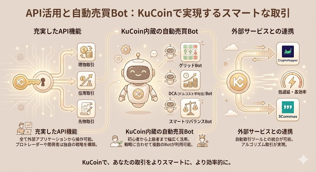 KuCoinはAPI機能が非常に充実しており、現物・信用・先物取引の全てを外部アプリケーションから操作可能です。これにより、プロトレーダーや開発者は独自の取引戦略を構築できます。