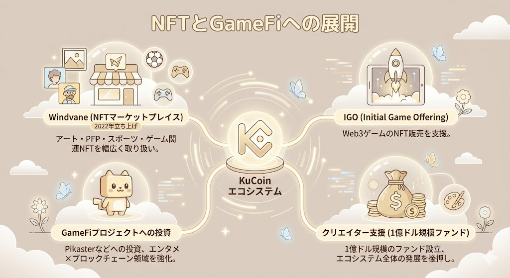 KuCoinは取引所の枠を超え、NFTとGameFiのエコシステム構築にも注力しています。2022年にはNFTマーケットプレイス「Windvane」を立ち上げ、アート・PFP・スポーツ・ゲーム関連のNFTを幅広く取り扱っています。