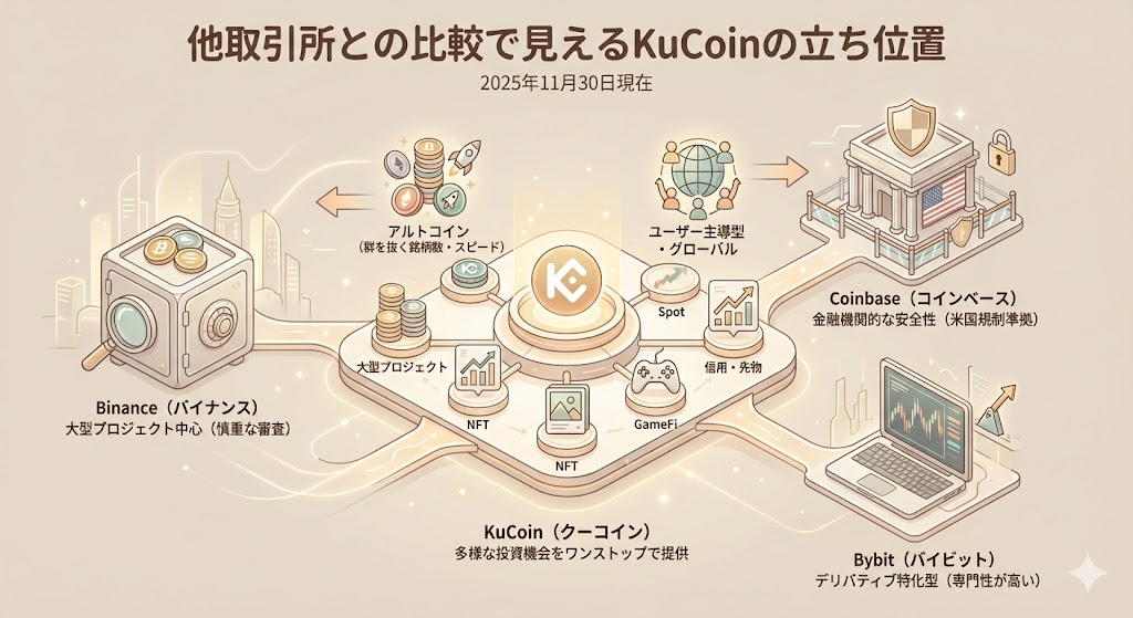KuCoinはBinanceやCoinbaseと並ぶ主要取引所のひとつですが、アルトコインの上場スピードと銘柄数では群を抜いています。Binanceが慎重な審査で大型プロジェクト中心なのに対し、KuCoinはより実験的かつ新興プロジェクトを早期にリストアップする傾向があります。