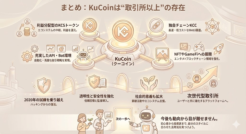 2020年のハッキングという大きな試練を乗り越え、透明性と安全性を強化し、社会的意義も拡大してきたKuCoin。「ユーザーと共に進化する次世代型取引所」として、その存在感はますます大きくなっていくでしょう。