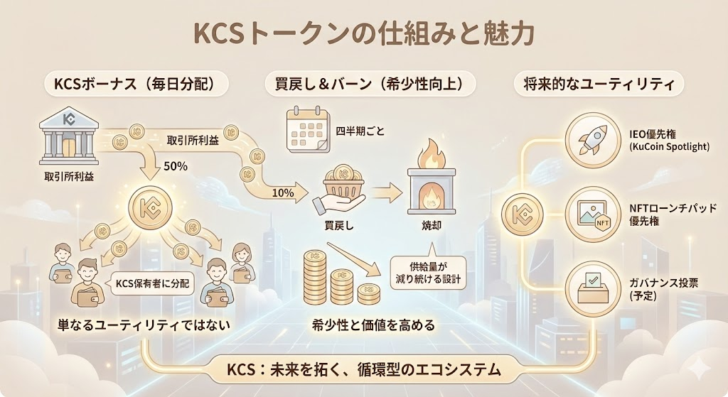 KCSはKuCoinが発行するネイティブトークンで、単なるユーティリティではありません。毎日、取引所の利益の50%がKCS保有者に分配される「KCSボーナス」という仕組みを持っています。