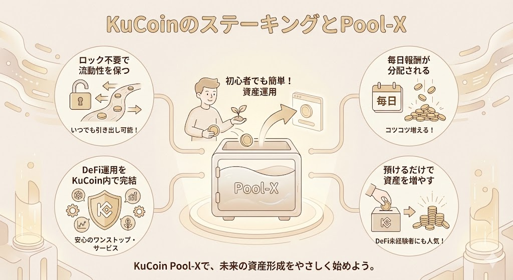 初心者でも簡単に資産運用ができる仕組みとして、KuCoinの「Pool-X」ステーキングがあります。特徴は以下のとおりです。