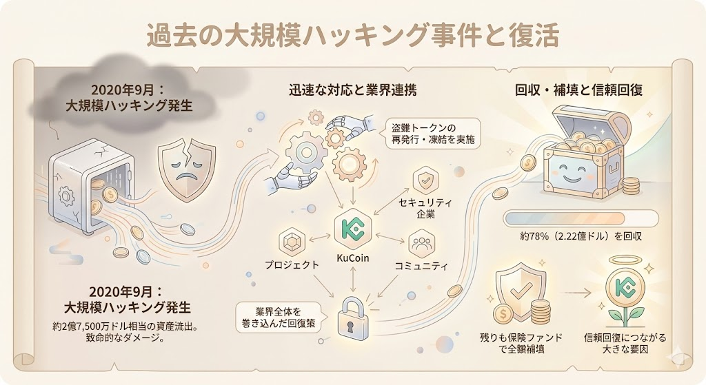 KuCoinのセキュリティ体制を語るには、2020年9月の大規模ハッキング事件を避けて通れません。約2億7,500万ドル相当の資産が流出し、当時は取引所として致命的なダメージと見られていました。