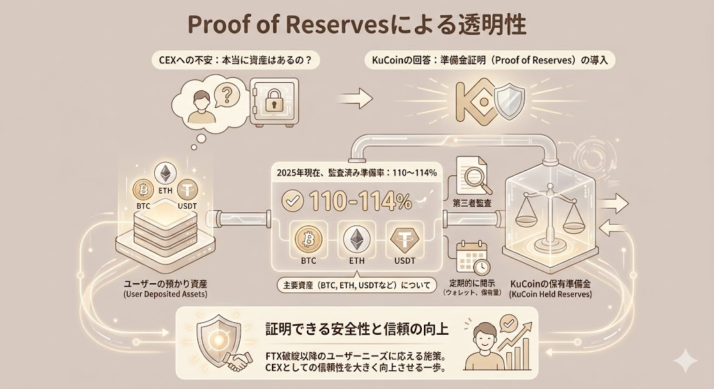CEX(中央集権型取引所)に対する最大の不安は、「本当に預けた資産が存在するのか?」という点です。KuCoinはこの課題に応えるため、Proof of Reserves(準備金証明)を導入しました。