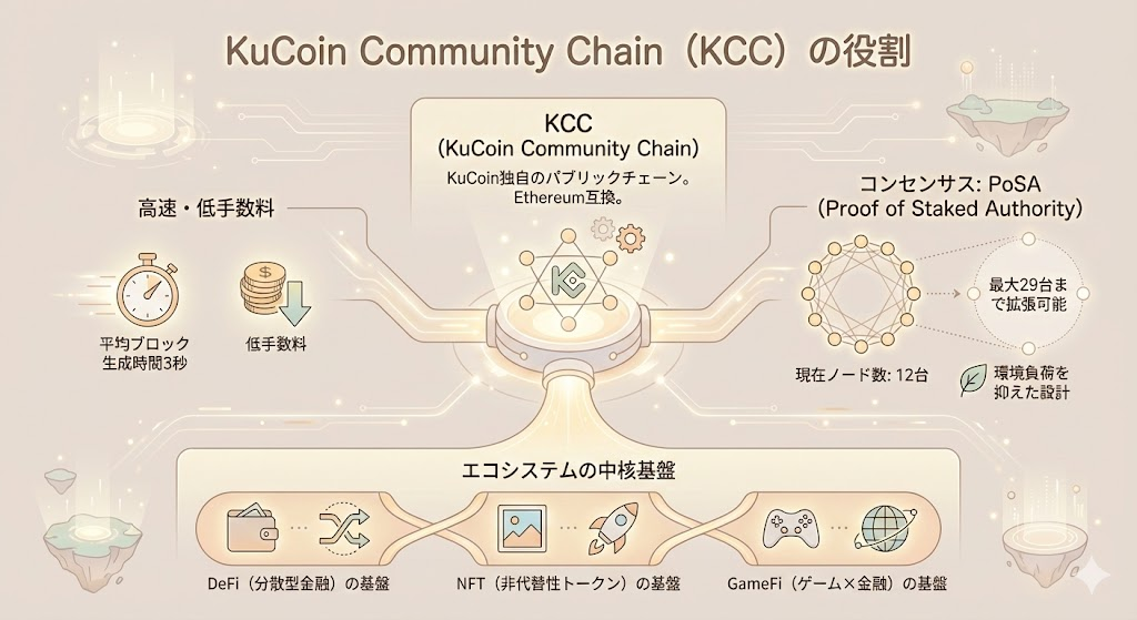 このKCCはDeFi・NFT・GameFiの基盤として活用され、KuCoinエコシステム全体の中核を担っています。