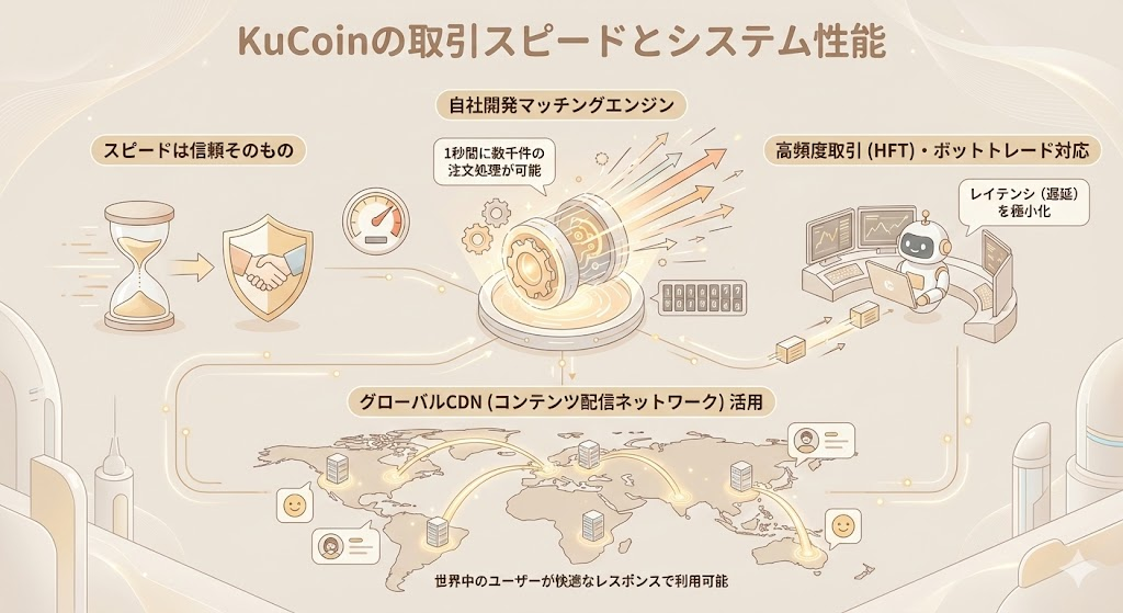 暗号資産取引において、スピードは信頼そのものです。KuCoinは自社開発のマッチングエンジンを搭載し、1秒間に数千件の注文処理が可能なシステムを構築しています。