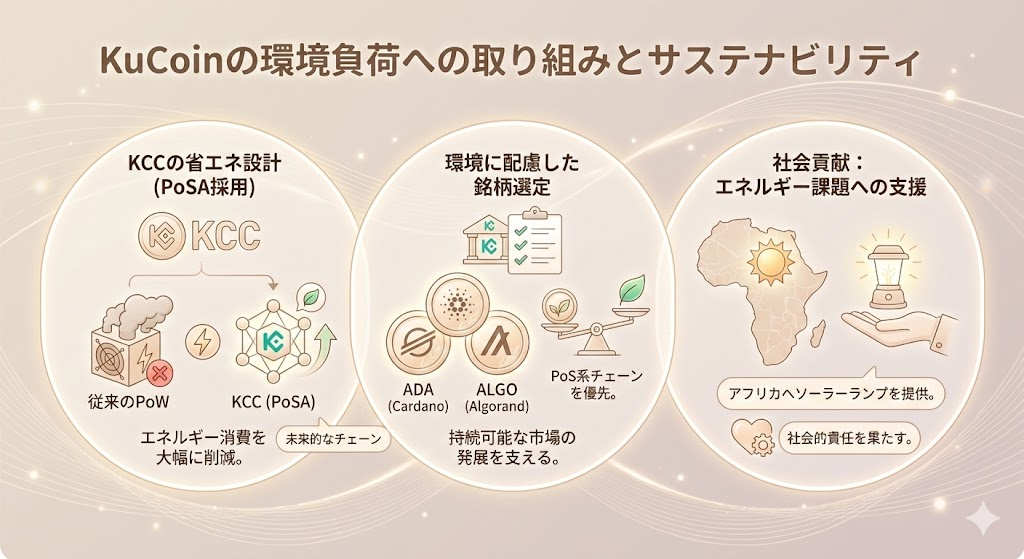 暗号資産業界では、環境負荷の低減が重要なテーマになっています。KuCoinはこの課題にも取り組んでおり、自社のチェーンであるKCCにおいてPoSA(Proof of Staked Authority)を採用。これにより、従来のPoW型チェーンよりもエネルギー消費を大幅に抑えています。