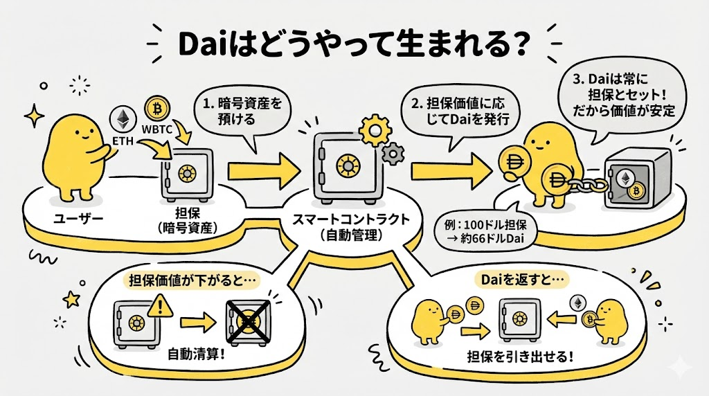 Daiは、ただ誰かが発行している通貨ではありません。 ユーザー自身が、自分の持つETHやWBTCなどの暗号資産を「担保」として預け、その担保価値に応じてDaiを発行する仕組みです。