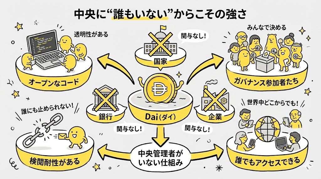 この「中央管理者がいない」仕組みがあるからこそ、Daiは検閲耐性があり、誰でもアクセスできる通貨になっています。