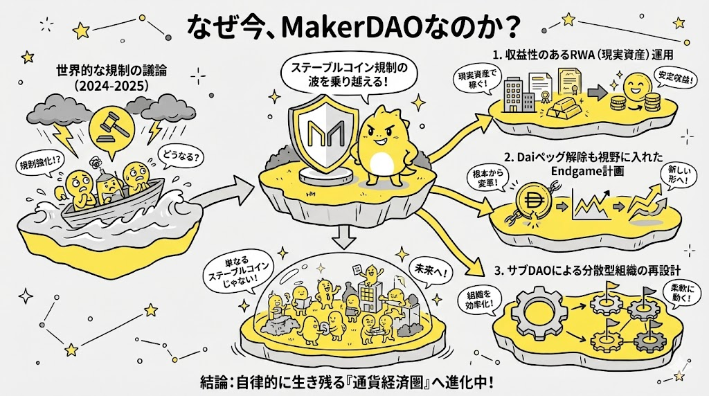 2024年から2025年にかけて、世界中で「ステーブルコイン規制」の議論が活発化しています。 その中でMakerDAOは、既に以下のような“生き残り戦略”を打ち出しています: