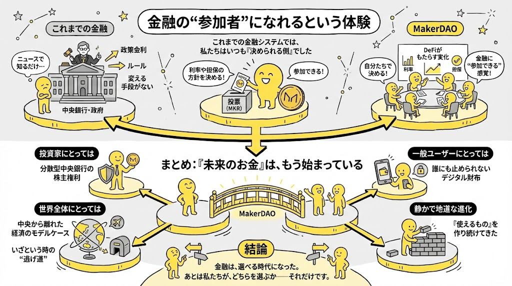 MakerDAOはただのアプリではなく、生きた経済システムです。 そこに関わるということは、単なる“使う側”ではなく“支える側”に立つということ。